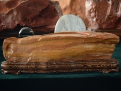 红丝石砚居四大名砚之首,产地是在青州的黑山。至宋末石源枯竭,历朝虽有产出,但数量相当稀少。 特征:泥质岩、硬度6.5左右,敲击声很脆,无厚料,从侧面看层状沉积岩特征明显,红黄相间,正面出现像树木年轮一样的红丝。红丝石:主产于红丝石洞,红丝石洞位于青州市黑山风景区,洞深80余米,高不足一米,只能匍匐入洞。老坑原石枯竭,新坑大多位于黑山阳面山坡及石刻檐下。据说对门洞亦有,只不过常年雨水冲积淤泥,洞底被淤泥堵死,尚若清除洞内积土,便能看到“世外桃源”,更有甚者言,洞原本深不见底,亦有可能发掘出古人遗迹。